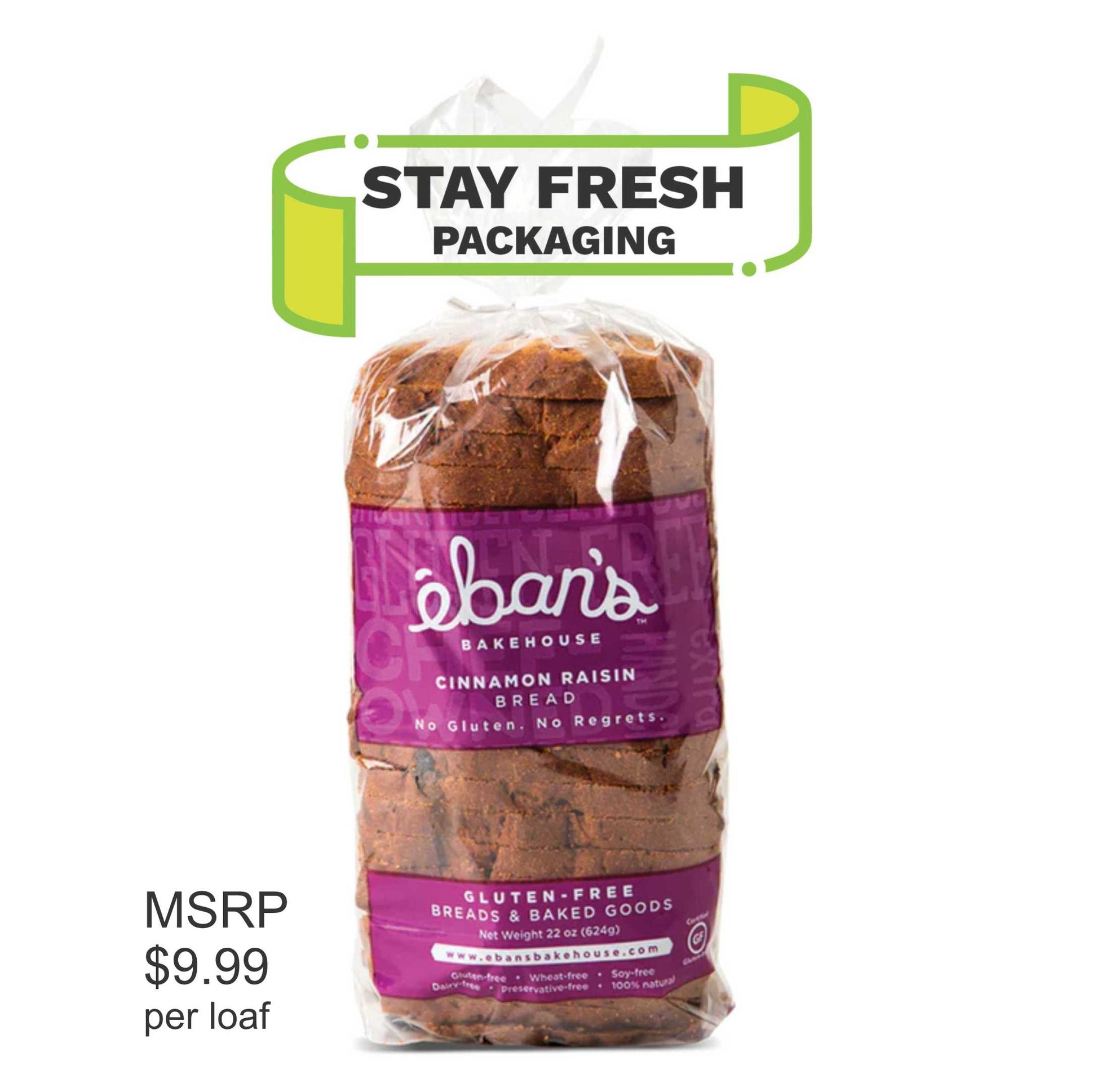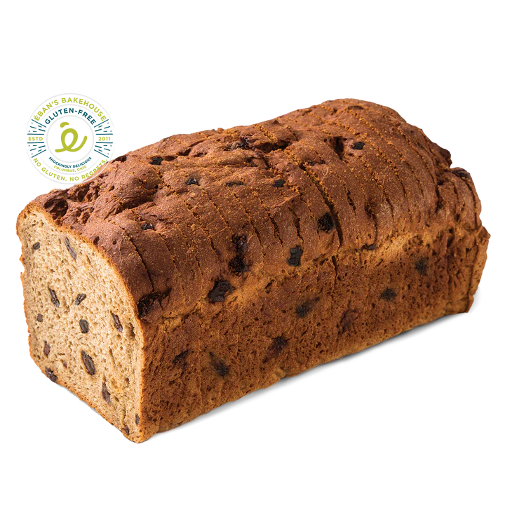 Loaded with plump, organic raisins and Saigon cinnamon along with our proprietary blend of whole and ancient grain gluten-free flours, free-roaming chicken eggs and pure vanilla extract- Éban’s Cinnamon Raisin Bread is free of soy, wheat, dairy and preservatives, and is our most popular breakfast loaf! While often served as French Toast, it truly steals the show when baked up into a gluten-free Cinnamon Raisin Bread Pudding. Éban’s Bakehouse is a veteran and family-owned, environmentally conscious, certified gluten-free bakehouse dedicated to using responsibly sourced, non gmo and organic ingredients in all our artisan, small batch, preservative-free baked goods. At Éban’s Bakehouse our motto is simple, yet bold, and it comes to life in everything we do: No gluten. No regrets!