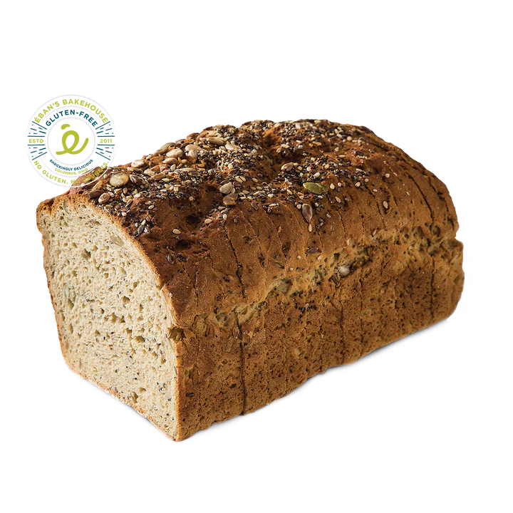 Chewy, soft and deliciously nutritious, Éban’s Award-winning Seeded Bread is free of soy, wheat, dairy and preservatives, yet loaded with organic poppy, sesame, chia, flax, sunflower and pumpkin seeds that are baked into this substantial loaf along with free-roaming chicken eggs and our proprietary gluten-free, whole grain flour blend of brown rice, certified gluten-free oat, ancient grain sorghum and tapioca flours. Like all our breads, the Seeded loaf holds up to the heartiest of fillings without requiring toasting and does not crumble or fall apart in the making of a sandwich. For added crunch and texture however, we do recommend toasting- it makes an amazing base for an avocado toast, for example, with the additional nutritional boost of polyunsaturated fats in all those organic seeds. Éban’s Bakehouse is a veteran and family-owned, environmentally conscious, certified gluten-free bakehouse dedicated to using responsibly sourced, non gmo and organic ingredients in all our artisan, small batch, preservative-free baked goods. At Éban’s Bakehouse our motto is simple, yet bold, and it comes to life in everything we do: No gluten. No regrets!